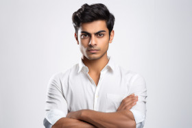 shopping and retail men realistic indian man young portrait standing crossed arms handsome confident serious determined professional business casual smart stylish beard mustache hair eyes face expression poseImagine Buddy