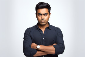 shopping and retail men realistic indian man young portrait standing crossed arms handsome confident serious determined professional business casual smart stylish beard mustache hair eyes face expression poseImagine Buddy
