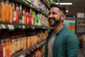 shopping and retail men realistic indian male grocery portrait smile positive attitude happy customer food market basket trolley aisle shelf product fresh healthy organic checkout cashier payment bag carry delivery home kitchen healthy living lifestyle diet nutritionImagine Buddy