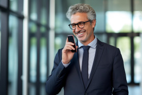 Smiling ceo uses business apps on phone