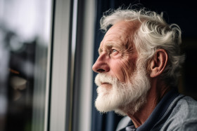 Senior man gazing out window thoughtfully