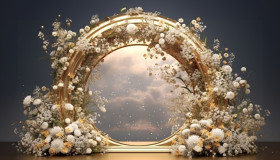 A gold mirror arch decorated with white flowers, free ai prompts and images floral photo backdrops