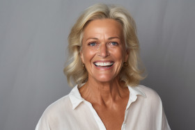 lifestyle seniors indoors positive attractive blonde woman posing shooting smile toothy happy joyful confident radiant beautiful elegant sophisticated glamorous stylish fashionable photogenic model portrait beauty headshot headshot wellness aging skincare makeup hair skincare dentistry dental oral health health beauty happiness confidenceImagine Buddy