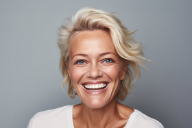 lifestyle seniors indoors positive attractive blonde woman posing shooting smile toothy happy joyful confident radiant beautiful elegant sophisticated glamorous stylish fashionable photogenic model portrait beauty headshot headshot wellness aging skincare makeup hair skincare dentistry dental oral health health beauty happiness confidenceImagine Buddy
