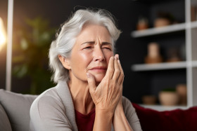 Portrait of senior woman touching face at home