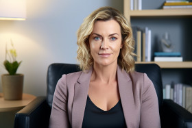 Professional middle aged female therapist in chair smiling at camera