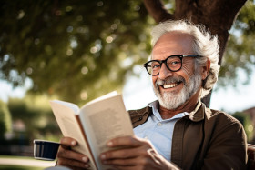 lifestyle seniors indoors man reading book happy drink coffee park leisure relax enjoy nature outdoors sunlight shadow bench table cup mug beverage drink smile laughter joy happiness peace contentment tranquility solitude serenity calm peaceful relaxing enjoyable retirementImagine Buddy