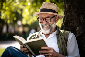 lifestyle seniors indoors man reading book happy drink coffee park leisure relax enjoy nature outdoors sunlight shadow bench table cup mug beverage drink smile laughter joy happiness peace contentment tranquility solitude serenity calm peaceful relaxing enjoyable retirementImagine Buddy