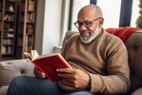 lifestyle seniors indoors man reading book couch home relax enjoy comfortable cozy learn wisdom knowledge education retire retirement leisure free time weekend holiday vacation peaceful serenity calm quiet content happiness joy satisfaction love life family friends memories happy healthy active independent elderly agingImagine Buddy