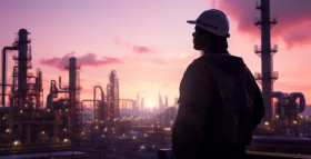An industrial workers silhouette in front of a city on top of an