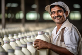 happy smiling milk dairy farmer busy working camera concept production agri business rural india growth agriculture livestock food nutrition healthy fresh natural sustainable ethical traditional culture community economy livelihood entrepreneur success opportunity prosperity development empowerment futureImagine Buddy