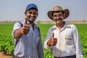 indian farmer agronomist cotton field thumbs up agriculture farming crop field india cotton organic cotton sustainability sustainable farming rural countryside happy farmer agronomist working together partnership success productivity harvest yield quality healthy food nutrition livelihood community developmentImagine Buddy