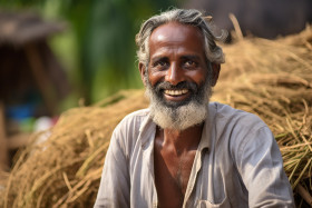 indian farmer portrait rural india happy man agriculture farming field crops traditional village turban dhoti mustache beard smile success prosperity abundance hardworking dedicated passionate proud joyful contented content peaceful serene calm relaxed happy life simple lifeImagine Buddy