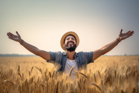 indian farmer young wheat field spreading arms happy successful prosperous agriculture rural india man smiling crop harvest nature outdoors countryside landscape sunshine blue sky golden green ears grain traditional culture lifestyle portrait work food security nutrition abundance peace joy satisfaction fulfillment gratefulness blessed positiveImagine Buddy