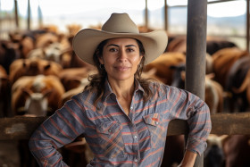 Mexican woman farmer smiling with cows