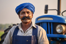 indian farmer mustache cross arms outdoor agriculture field blue tractor rural india happy portrait man smiling beard worker people person human face nature countryside village farm land soil crop plant harvest cultivation prosperity growth success business entrepreneur food security prideImagine Buddy
