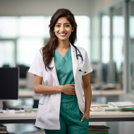indian woman hospital administrator work friendly smiling beautiful blurred background health care smile happy professional medical doctor nurse patient reception patient care hospital managementImagine Buddy