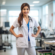 indian woman occupational therapist friendly smiling beautiful work blurred background female person adult young professional health care medicine treatment rehabilitation patient help support recovery assistance therapy sessionImagine Buddy