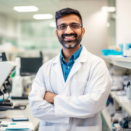 laboratory technologist indian man handsome smiling friendly work blur background microscope test tube sample slide coat gloves safety glasses hairnet beard young adult male professional medical healthcare scientist research analysisImagine Buddy