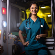 indian woman ambulance driver friendly smiling beautiful medical emergency healthcare frontline first responder hero uniform work blurred background portrait headshot female smile happy joy kindness compassion care help life save protect serve duty dedication commitmentImagine Buddy