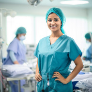 indian woman surgeon smiling friendly beautiful work blurred background doctor healthcare medicine profession career occupation job person human adult female hospital clinic surgery operating room table medicalImagine Buddy