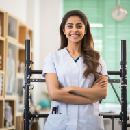 indian woman physical therapist work blurred background friendly smiling beautiful healthcare wellness fitness rehabilitation injury recovery pain muscle joint spine massage movement exercise therapy treatment patient care help support professional skilled experienced dedicated passionate friendly approachableImagine Buddy