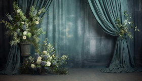 A backdrop with blue curtains and flowers, free ai prompts and images floral photo backdrops