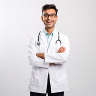 indian man biomedical engineer work white background friendly smiling handsome professional career occupation job science technology medicine healthcare research development innovation lab microscope computer equipment tools happy successful motivated confident passionate intelligentImagine Buddy