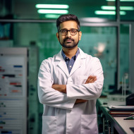 biomedical engineer indian male handsome confident work blurred background workplace professional technology science health medicine research innovation development medicine doctor patient hospital laboratory clinic medical device equipment uniform lab coatImagine Buddy