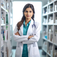 pharmacist indian woman confident beautiful work blurred background healthcare medicine pharmacy hospital doctor nurse medical health professional smile happy helping caring compassion kindness empathy trust friendly approachable competent reliable knowledgeable experienced skilled caringImagine Buddy