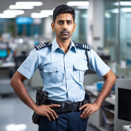 indian man security guard hospital personnel work blurred background healthcare profession uniform badge confident handsome professional responsible trustworthy reliable brave strong protector safety peace helping caring alert focused determined vigilant duty dedication serviceImagine Buddy
