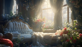 A room with a white curtain, free ai prompts and images floral photo backdrops