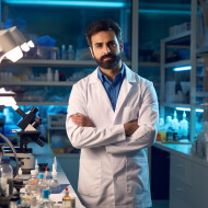 confident handsome indian man research scientist work blured background lab coat beaker test tube microscope slide petri dish notes clipboard computer data analysis experiment discovery innovation technology science medical researcher professional careerImagine Buddy