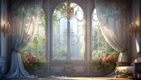 A window has curtains on it next to the wall, free ai prompts and images floral photo backdrops