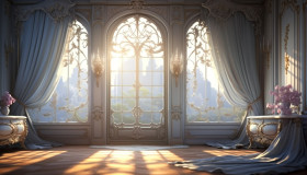 A window has curtains on it next to the wall, free ai prompts and images floral photo backdrops