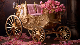 Gold carriage in full glory with pink flowers on it, free ai prompts and images floral photo backdrops