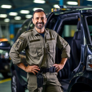 Friendly smiling handsome man automotive security personnel at work on blured background