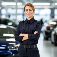 Friendly smiling beautiful woman automotive security personnel at work on blured background