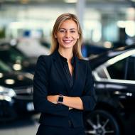 automotive sales representative woman friendly smiling beautiful work blurred background car dealership lot showroom customer service advisor consultant professional friendly happy confident approachable helpful knowledgeable trustworthy reliable passionate dedicatedImagine Buddy