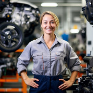 automotive woman manager parts smiling friendly beautiful work blurred background car vehicle auto mechanic repair shop dealership service customer help assistance advice professional hardworking dedicated confident successful leader role model inspirationImagine Buddy
