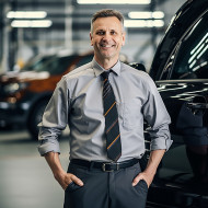 Friendly smiling handsome man automotive general manager at work on blured background