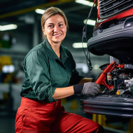automotive detailer woman friendly smiling beautiful at work blurred background car wash clean detailing shine polish wax vacuum interior exterior wheels tires engine windows headlightsImagine Buddy