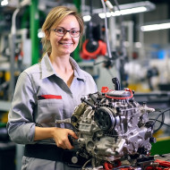 automotive woman specialist parts friendly smiling beautiful work background blurred smile happy mechanic engineer technician female professional career role job occupation employment industry business service repair maintenance assistance customer service help supportImagine Buddy