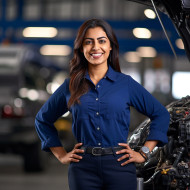 indian woman automotive safety compliance specialist work blurred background friendly smiling beautiful female happy professional career job business entrepreneur employment engineer technician mechanic worker occupation office industry company organization corporation technology innovation futureImagine Buddy