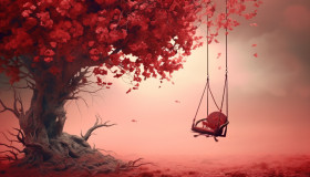 A swing is hanging from an ornamental red tree, free ai prompts and images floral photo backdrops