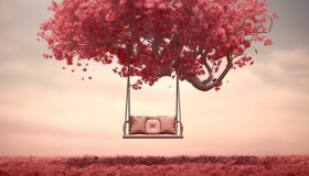 A swing is hanging from an ornamental red tree, free ai prompts and images floral photo backdrops