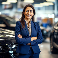 automotive sales representative woman indian friendly smiling beautiful work blurred background business customer service car dealership vehicle purchase lease finance insurance loan paperwork contract negotiation closing deal commission success satisfaction happyImagine Buddy