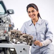 woman indian automotive quality control inspector work white background friendly smiling beautiful portrait happy professional female employee occupation career job industry manufacturing assembly line inspection parts vehicles carsImagine Buddy