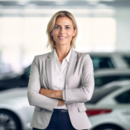 Friendly smiling beautiful woman automotive general manager at work on blured background