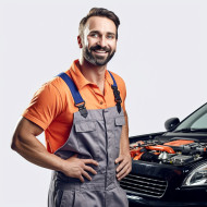 mechanic technician automotive service friendly smiling handsome man work white background uniform overalls gloves hardhat tools equipment workbench garage car truck vehicle auto shop repair maintenance engine oil tires brakes battery alignmentImagine Buddy